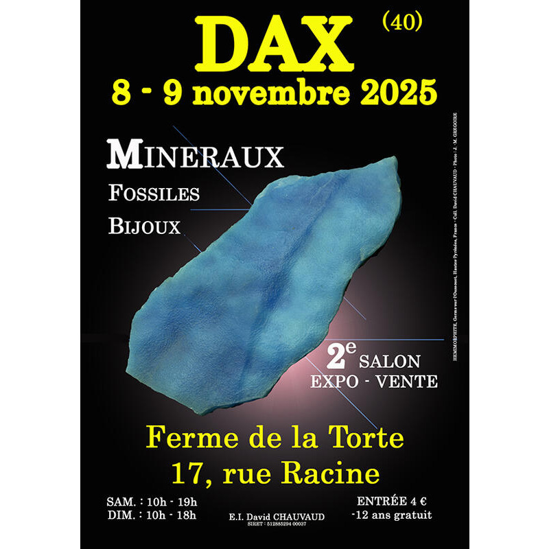 Hexagone mineral vous donne rendez-vous les 8 et 9 novembre 2025 pour le 2e salon minéraux fossiles et bijoux de dax (landes). Cet événement se déroulera dans la salle de la torte située 17, rue racine. Les exposants professionnels ou amateurs participant à cet événement présenteront au public leurs dernières nouveautés en provenance du monde entier mais aussi de france et du grand sud-ouest. Comme dans tous nos salons, un très large choix de minéraux, fossiles et bijoux sera proposé à la vente pour le plus grand bonheur des petits et des grands. Pour répondre toujours plus aux attentes du public, un service d'expertise gratuite sera aussi proposée par l'organisateur à celles et ceux qui souhaitent faire déterminer leurs découvertes minéralogiques ou paléontologiques. Ce rendez-vous incontournable devrait réunir de très nombreux passionnés de la région. Nous mettons tout en œuvre pour que ce week-end remplisse d'émerveillement les passionnés tout en sensibilisant les néophytes et les plus jeunes !
