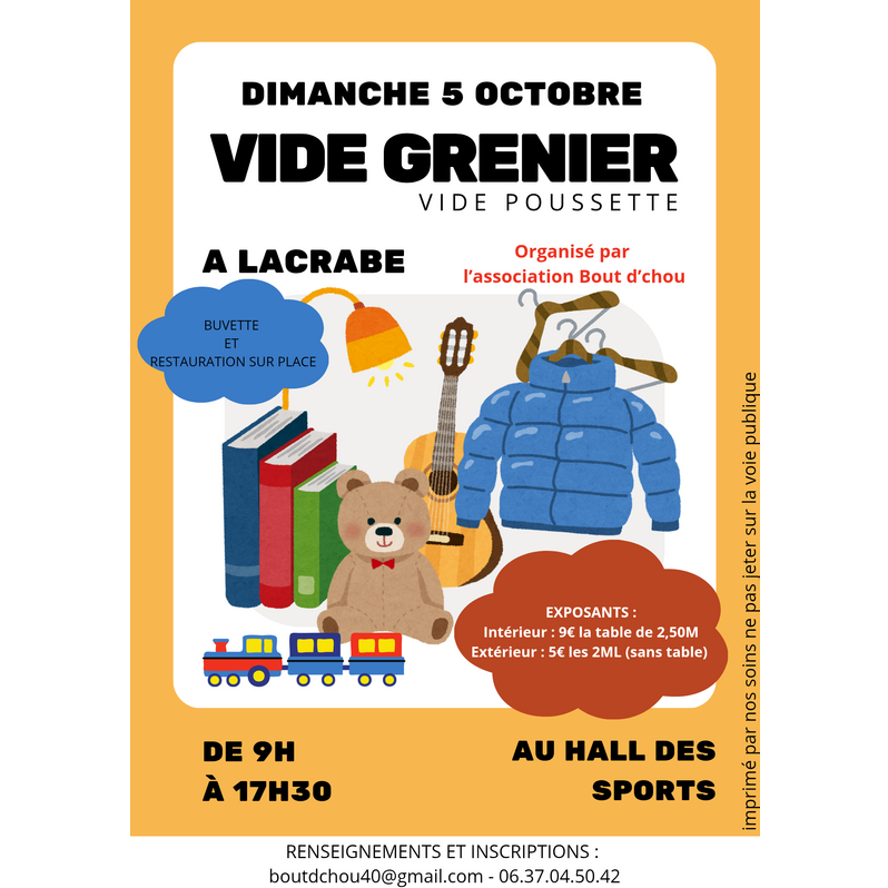 Vide-grenier/ vide-poussette, exposition intérieure et extérieure. Parking et entrée gratuite.