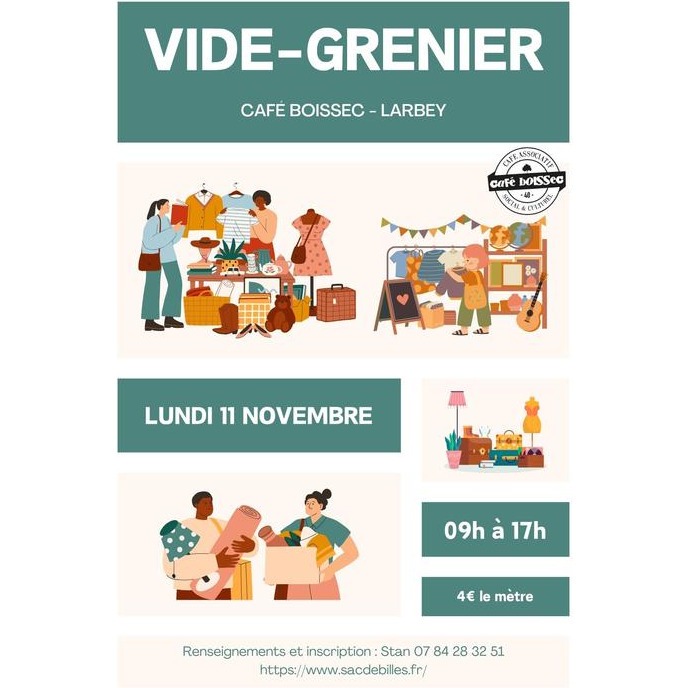 Vide-grenier de 09h00 à 17h00, ouverture exposants à 07h00. Buvette et restauration sur place.