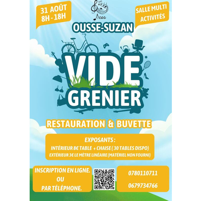 Vide-greniers de l'association culturelle d'ousse-suzan avec buvette et petite restauration (suacisses, ventrèches, glaces) et animation musicale l'aprés-midi à partir de 14h30.