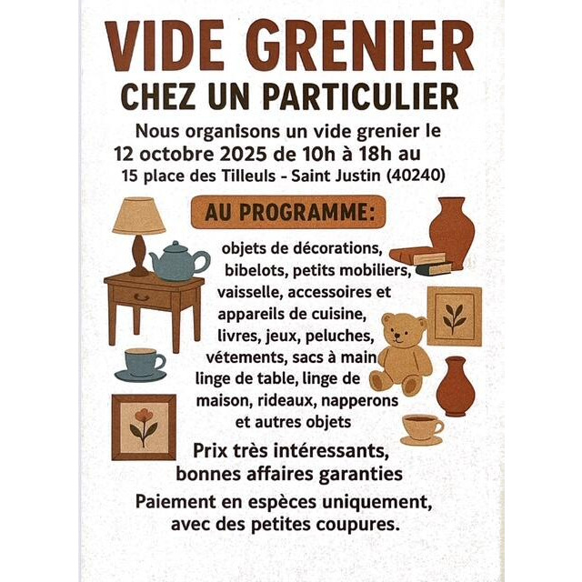 Vide grenier chez un particulier, le dimanche 12 octobre 2025, de 10h à 18h, au 15 place des tilleuls (st justin 40240). Vous trouverez divers objets, bibelots, objets de décoration, jeux de société, peluches, accessoires de cuisine et de table, nappes, serviettes, draps, petites chaises pour enfant, vêtements, sacs, livres….Petits pris garantis et paiement en espèces uniquement.