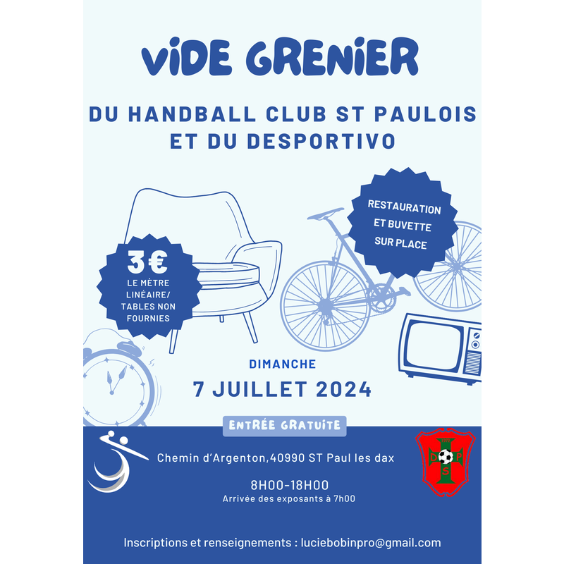 Vide grenier organisé par le handball club st paulois ainsi que par le desportivo. Restauration et buvette sur place.