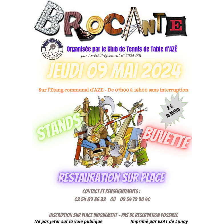 Le club de tennis de table d' azé organise sa 23ème brocante le jeudi de l'ascension 9 mai 2024 de 7h à 18h sans interruption.