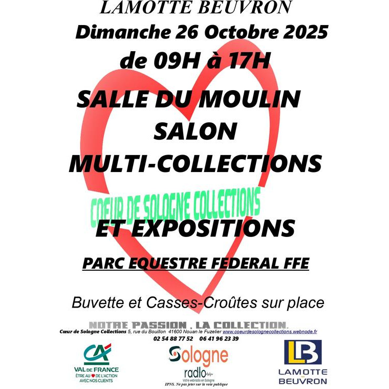 Nous organisons notre nouveau salon des collectionneurs, à la salle du moulin, au parc équestre fédéral de lamotte beuvron. Comme d'habitude, vous pourrez y retrouver les collections habituelles (monnaies, timbres, fèves, pin's, miniature et des moins communes). Le romo rc modèles, de romorantin, sera présent, pour le plaisir des petits et des grands .En plus il y aura plusieurs expositions. Pour savoir quelles expos, il faudra venir...!!! Le chemin pour accéder à la salle du moulin de la ffe sera flécher depuis le centre de lamotte beuvron. Entrée gratuite, buvette et petite restauration. Cette manifestation est organisée, en partenariat avec la ville de lamotte beuvron, le crédit agricole val de france, super u salbris, fréquence trois la radio locale et sologne radio votre web radio, au coeur de la sologne.