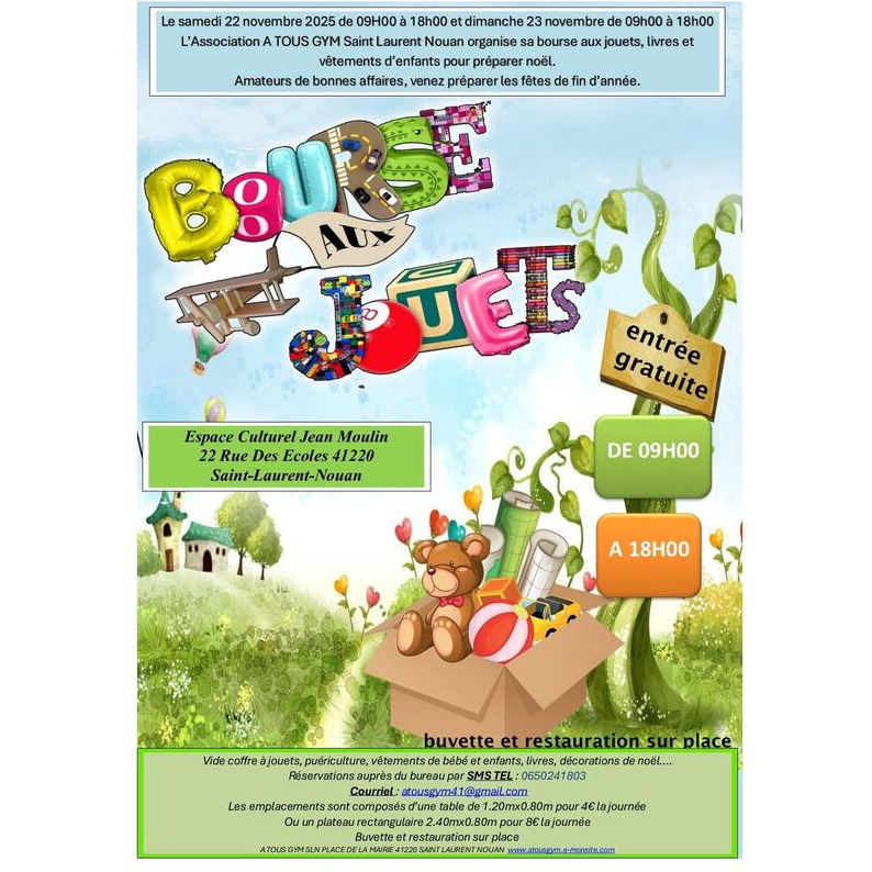 l’association a tous gym saint laurent nouan organise sa bourse aux jouets, livres et vêtements d’enfants pour préparer noël. Vide coffre à jouets, puériculture, vêtements de bébé et enfants, livres, décorations de noël….