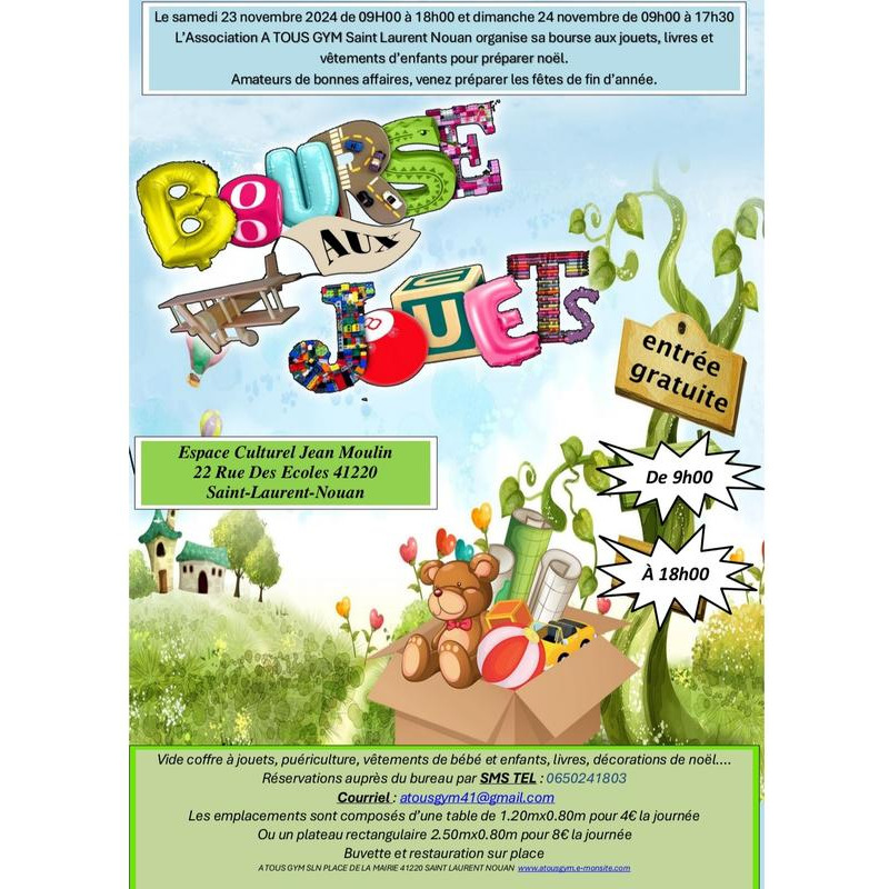 l’association a tous gym saint laurent nouan organise sa bourse aux jouets, livres et vêtements d’enfants pour préparer noël. Vide coffre à jouets, puériculture, vêtements de bébé et enfants, livres, décorations de noël….