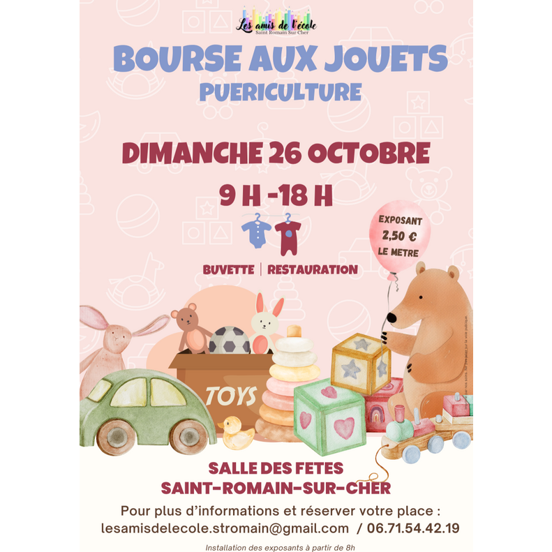 Vous cherchez de bonnes affaires pour vos enfants ou souhaitez faire de la place à la maison ? Rendez-vous dimanche 26 octobre, de 9h à 18h, à la salle des fêtes de saint-romain-sur-cher pour la bourse aux jouets et à la puériculture, organisée par les amis de l’école.