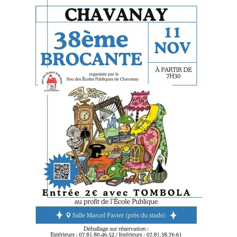 venez nous rejoindre pour cette 38ème édition de la brocante, organisée par le sou des écoles publiques de chavanay. Vous pourrez visiter, en intérieur comme en extérieur, et profiter sur place d'une buvette et d'un stand de restauration. Votre entrée, au tarif de 2€, vous fera automatiquement participer à notre grande tombola, ainsi qu'au projets scolaires des écoles publiques de la ville. Nous vous en remercions.