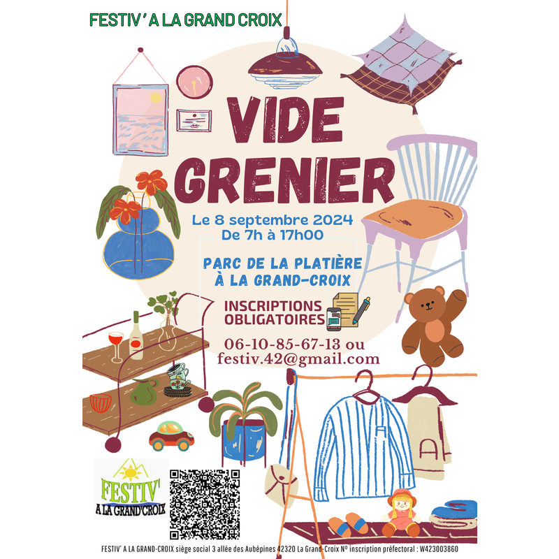 Vide-greniers organisé par l'association festiv à la grand-croix le dimanche 8 septembre de 7h00 à 17h00 au parc de la platière de la grand-croix.