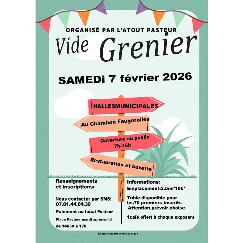 Vente d'objets divers aux halles municipales ( très grande salle) en plein centre ville du chambon feugerolles, accès facile pour les personnes à mobilité réduite. Buvette avec petite restauration. Il y a un parking devant la salle.