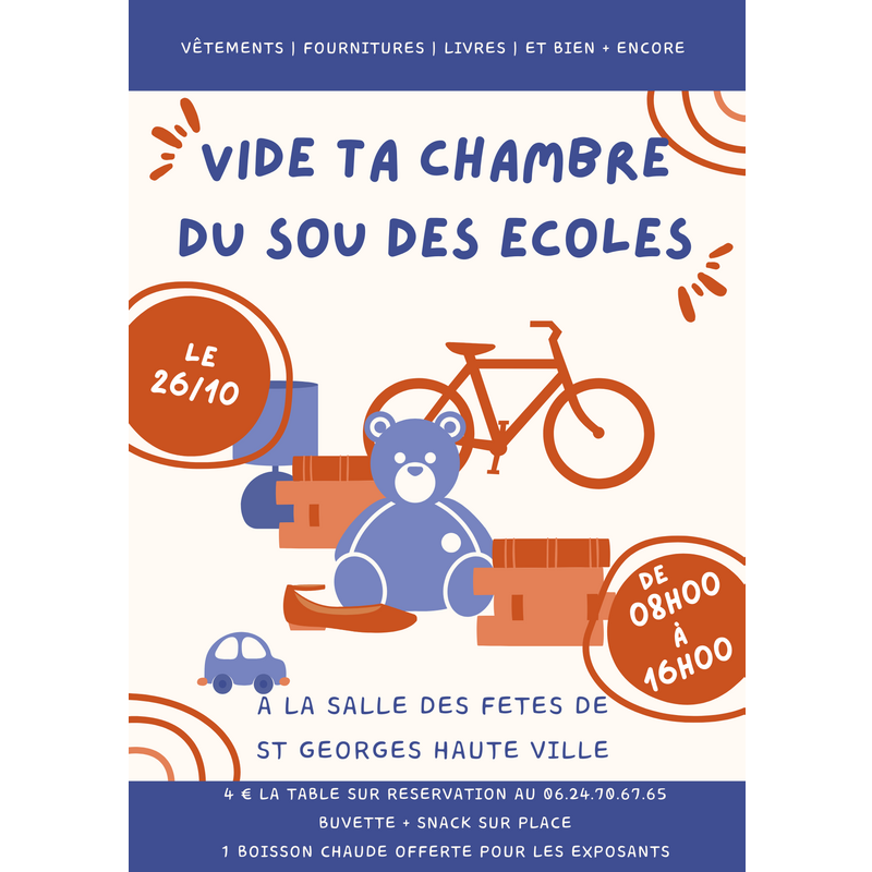 Le sou des écoles organise son vide ta chambre ( vente de vêtements, livres, jouets, puériculture etc...) petite restauration sur place sur réservation de préférence