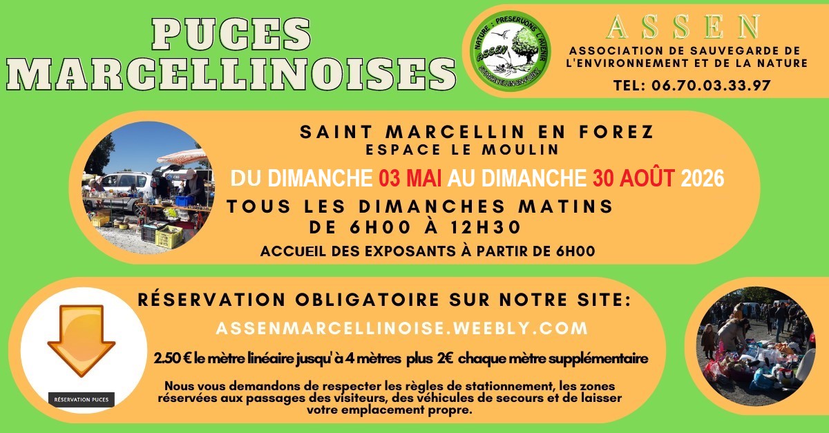 Vide-grenier à l'ambiance familiale tous les dimanches matin de 6h30 à 12h30 à l'entrée du village de St-Marcellin en Forez. Annulation en cas de fortes pluies. Accès interdit par le centre bourg. Suivre la déviation. Parkings municipaux gratuits à côté de l'espace des Puces.