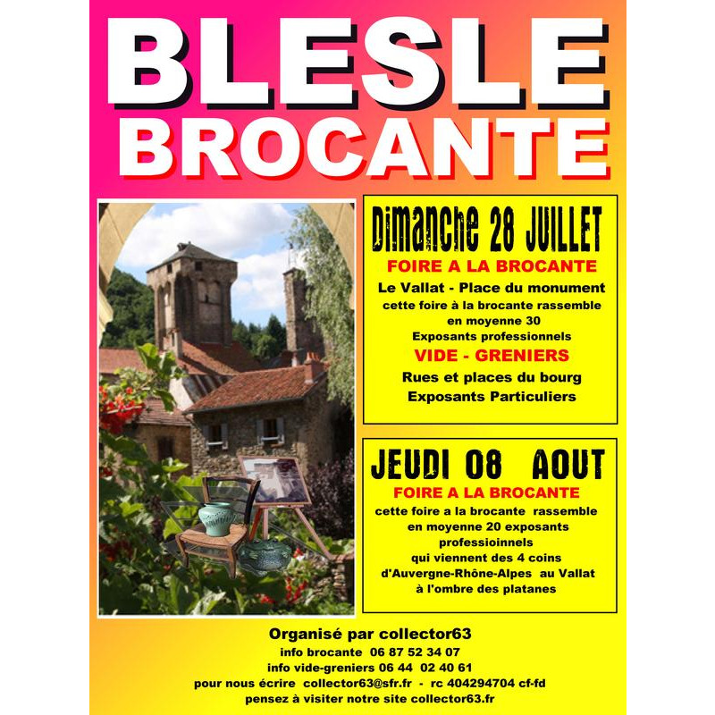 Traditionnel brocante de blesle organisé par collector63 exposants professionnels le vallat- place du monument qui rassemble en moyenne 25 exposants professionnels qui viennent des 4 coins d'auvergne rhône alpes