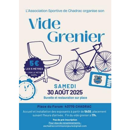 Vide grenier de l'as chadrac. N’oubliez pas de vider vos équipements sportifs ! Buvette et restauration sur place.