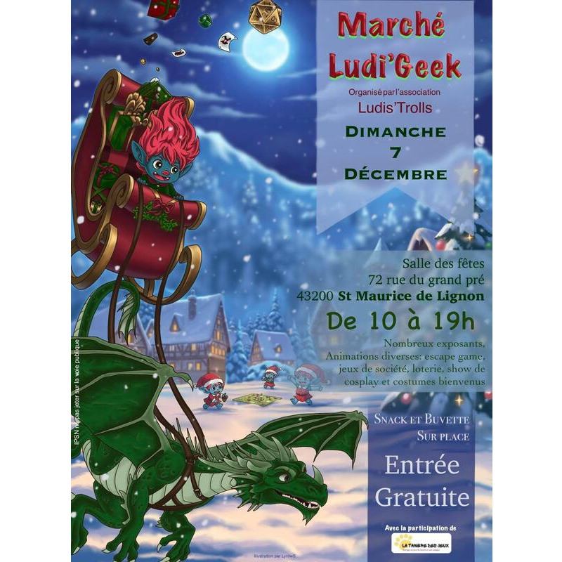 Bonjour bienvenues a notre tout premier marché quoi de prévu ? Vous n'allez pas en revenir ! . De la diversité ? Ok + de 35 exposants ! Et en intérieur en plus . Envie d'une pause ludique ? La tanière des jeux sera là pour vous divertir et on vous explique les règles ! . De l'animation ? Aucun soucis shows cosplay à 10h45 et 14h45, et deambulation cosplay, animé par stellyse cosplay (photos bienvenues). Mais pas que... Un escape game itinérant ! 2 aventures proposer par coffrologique escape game . Des cadeaux ? Ouiii, une lotterie sera organisée avec plus de 40 lots à gagner !! (en remerciant chaque exposant et france murder ainsi que la tanière partenaire de l'association pour leur généreuse participation ). . Vous avez faim ? Vous avez soif ? Buvette et snack seront disponibles et nos bénévoles se feront un plaisir de vous servir. Stand de photo libre avec décor et père noël présent de 11h-12h et 15h-17h. Vous avez des questions ? Contactez-nous sur instagram, messenger, par mail : ou par téléphone grand parking devant la salle.