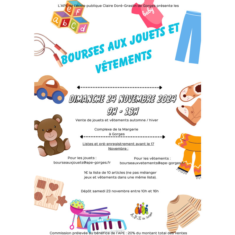 L'association des parents d'elèves de l'école publique claire doré graslin organise une bourse aux jouets et aux vêtements.