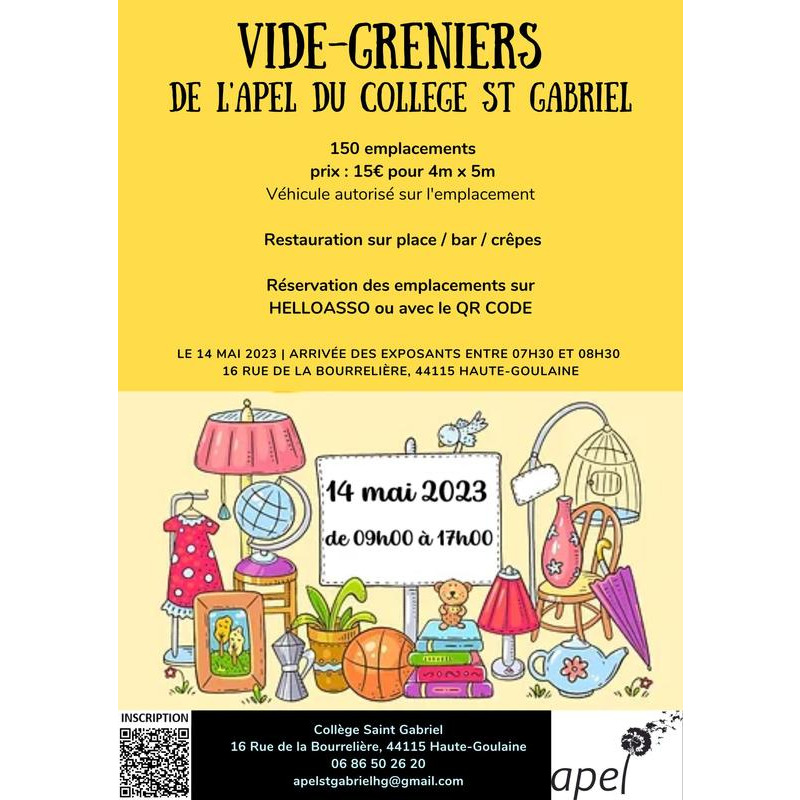 L’apel du collège saint gabriel de haute-goulaine vous accueille le 07 avril 2024 pour son grand vide-greniers dans l’enceinte de l’établissement, un cadre verdoyant exceptionnel.