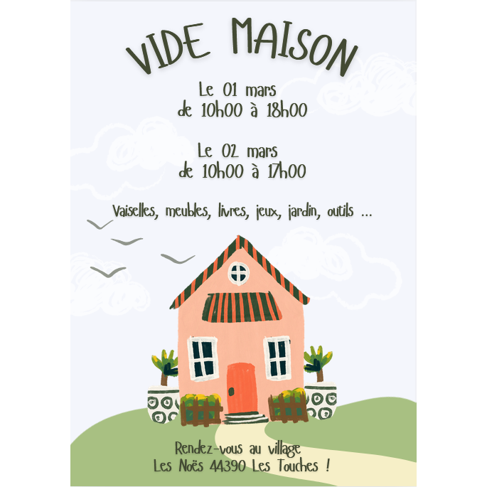 Vide maison le 01 mars 2025 de 10h à 18h et le 02 mars 2025 de 10h à 17h.