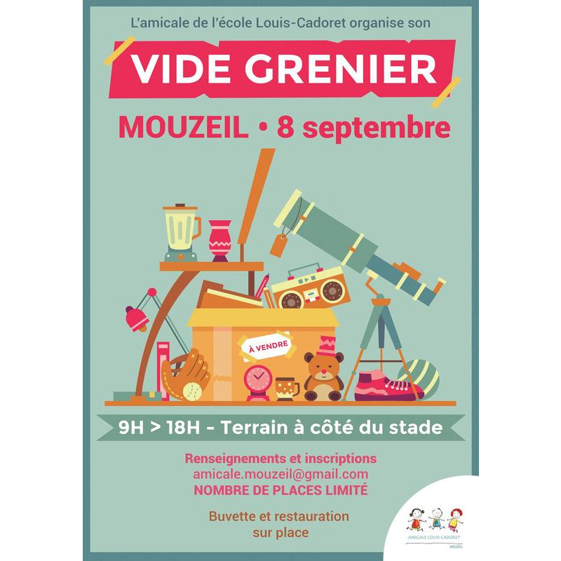 L’amicale de l’école louis-cadoret de mouzeil organise un vide grenier dimanche 8 septembre de 9h à 18h sur le terrain à côté du stade de football (rue du stade).