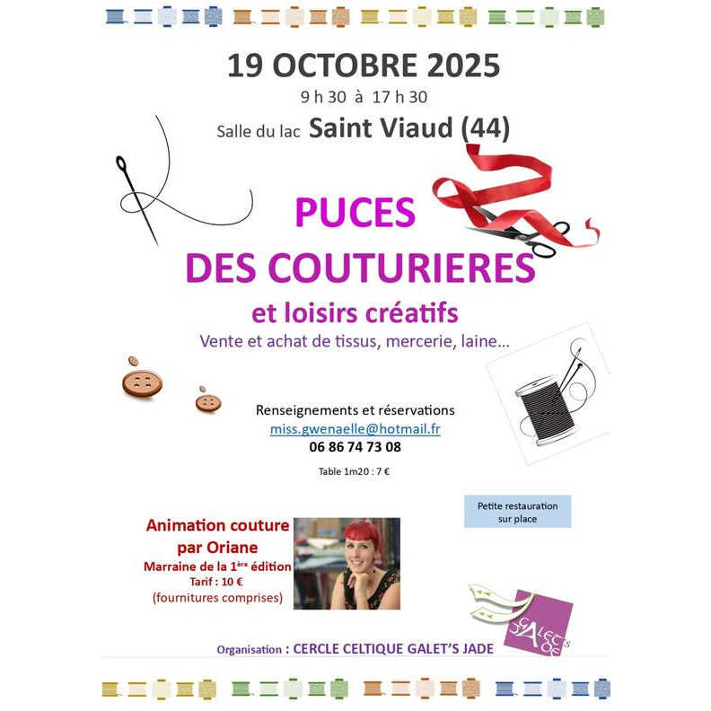 Puces des couturières & loisirs créatifs saint-viaud – salle du lac ???? Dimanche 19 octobre 2025 grande première pour le cercle celtique galet’s jade : nous organisons nos toutes premières puces des couturières & loisirs créatifs ! Vous êtes passionné(e) de couture, de bricolage, de diy ou de création en tout genre ? Venez découvrir, échanger, chiner… ou même réserver votre emplacement pour exposer vos trésors ! (attention : il ne reste que quelques places de libres pour les exposants… alors n’attendez plus et réservez vite votre emplacement, elles partent très vite !) pour rendre cette journée encore plus spéciale, nous aurons l’immense joie d’accueillir comme marraine oriane – la grande rouge oriane cousu main 2, créatrice talentueuse et reconnue, que vous avez pu découvrir dans l’émission cousu main 2 sur m6 . Cet événement a pour but de soutenir la création de nos costumes traditionnels, essentiels à la vie de notre troupe. Et l'entrée est gratuite pour le public ! Partagez autour de vous, venez nombreux et soutenez-nous dans cette belle aventure placée sous le signe de la créativité, de la convivialité et de la bonne humeur !