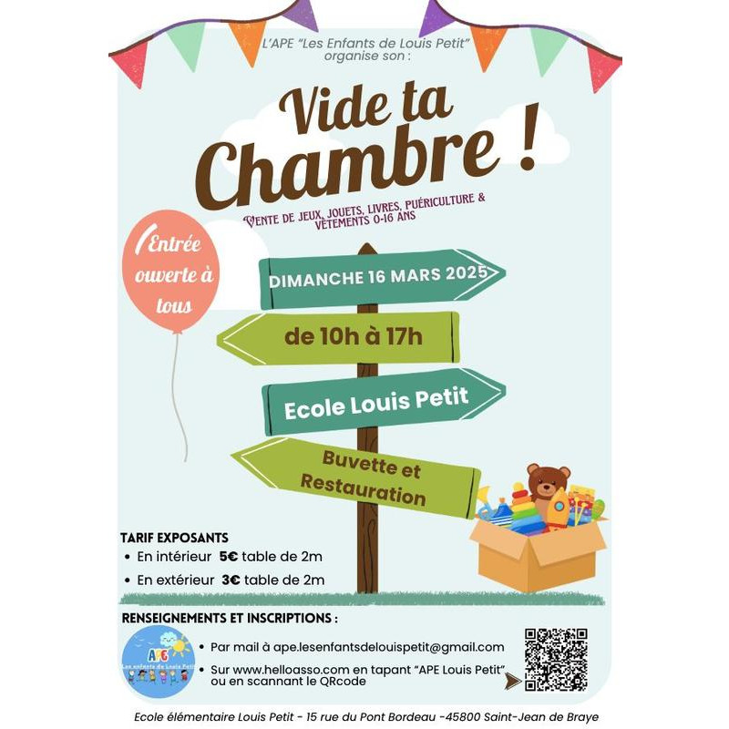 Vous souhaitez faire de belles affaires pour équiper vos enfants et leur faire plaisir ? Vous souhaitez faire le tri et vendre les affaires dans les placards de vos enfants (jeux, livres, jouets, vêtements 0-16 ans, matériel de puériculture... ) ? C'est l'occasion en participant au vide ta chambre organisé par l'association de parents d'élèves de l'école louis petit de saint-jean de braye !