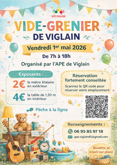 L'Association des Parents d'élèves de Viglain organise son traditionnel grand vide-grenier du 1er Mai. Emplacements disponibles dans la salle polyvalente ou à l'extérieur. Buvette et restauration sur place. Pêche à la ligne pour les enfants.