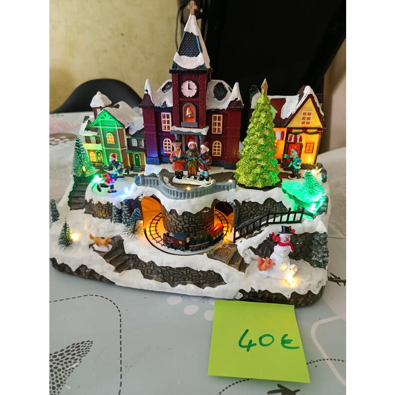 Village de noël, personnages,fête foraine, skieurs, déco de noël