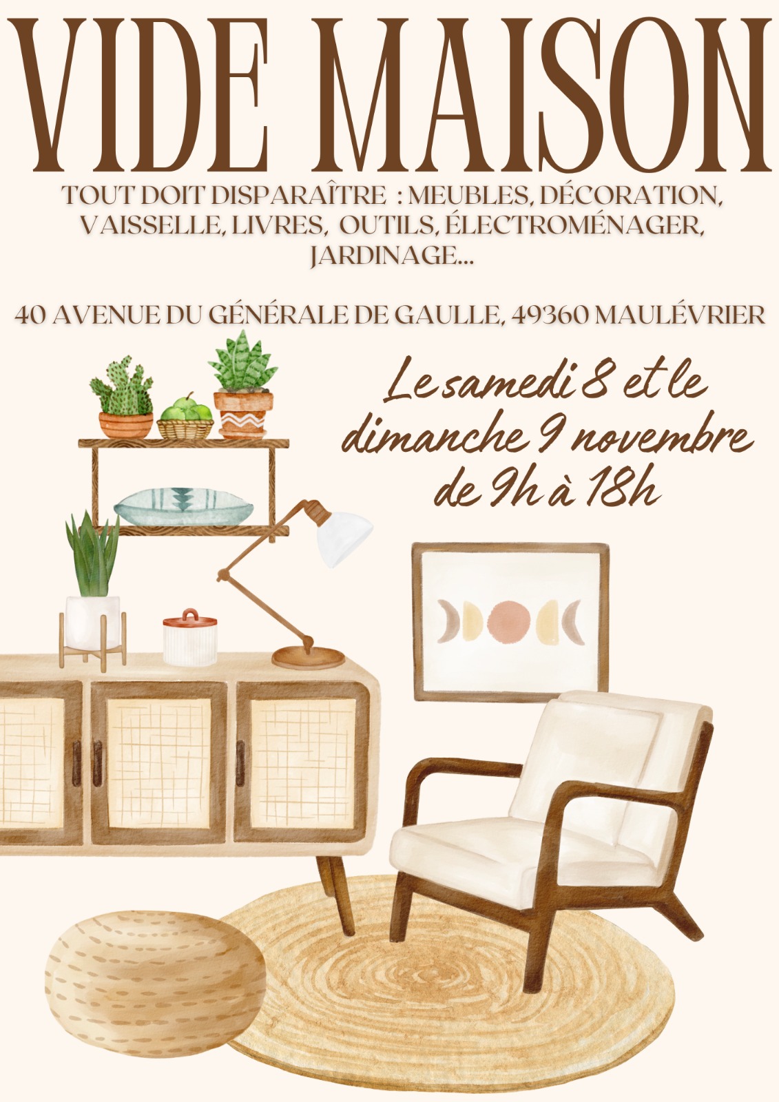 Vide maison : meubles, outillages, décorations, vaisselle, électroménager livres, jardinage. Ouvert de 9h à 18h