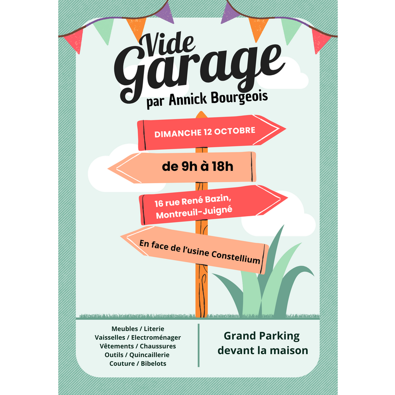 Vide garage comportant : literie, outils, quincaillerie, petit et gros mobiliers, électroménager, couture, vêtements, chaussures, bibelots, vaisselles...