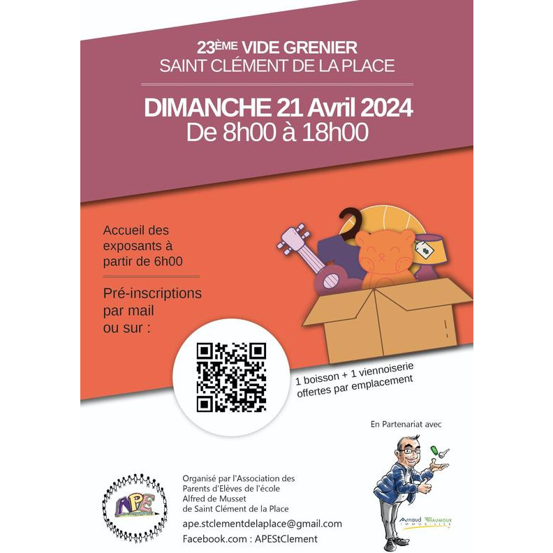 L'ape de l'école alfred de musset de saint clément de la place organise son 23e vide grenier le dimanche 21 avril 2024 de 8h à 18h.