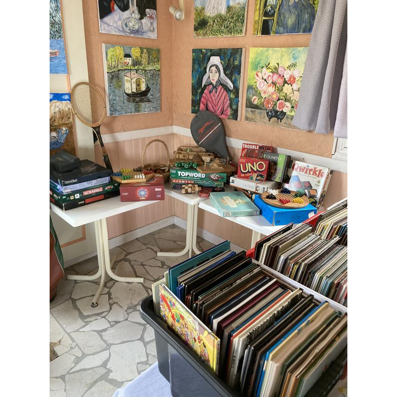 Vaisselle, bibelots, meubles, jeux de société, livres anciens, nombreuses bd, barbecue, équipement golf, tableaux, outillage, cariole hyppomobile, etc…