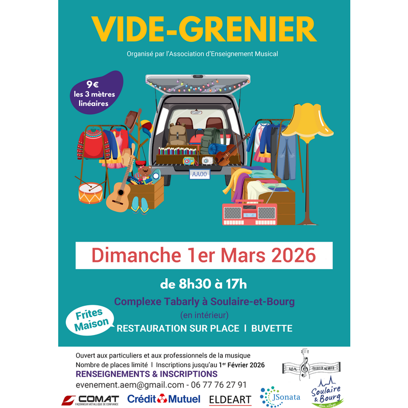 La 4ème édition du vide grenier organisé par l'association d'enseignement musical de soulaire et bourg (49) se déroulera le dimanche 1er mars 2026 de 8h30 à 17h.
