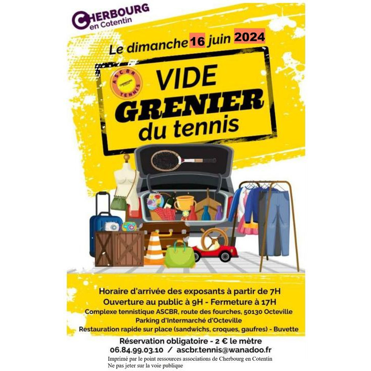 Vide grenier sur le parking du club de tennis, restauration rapide sur place (sandwichs, croques, gaufres), buvette.