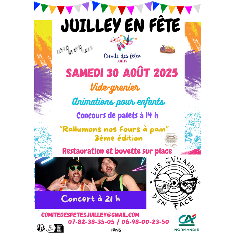 Vide-grenier, animations pour enfants, concours de palets à 14 h, 3ème édition « rallumons nos fours à pain », concert « les gaillards d’en face » à 21 h.