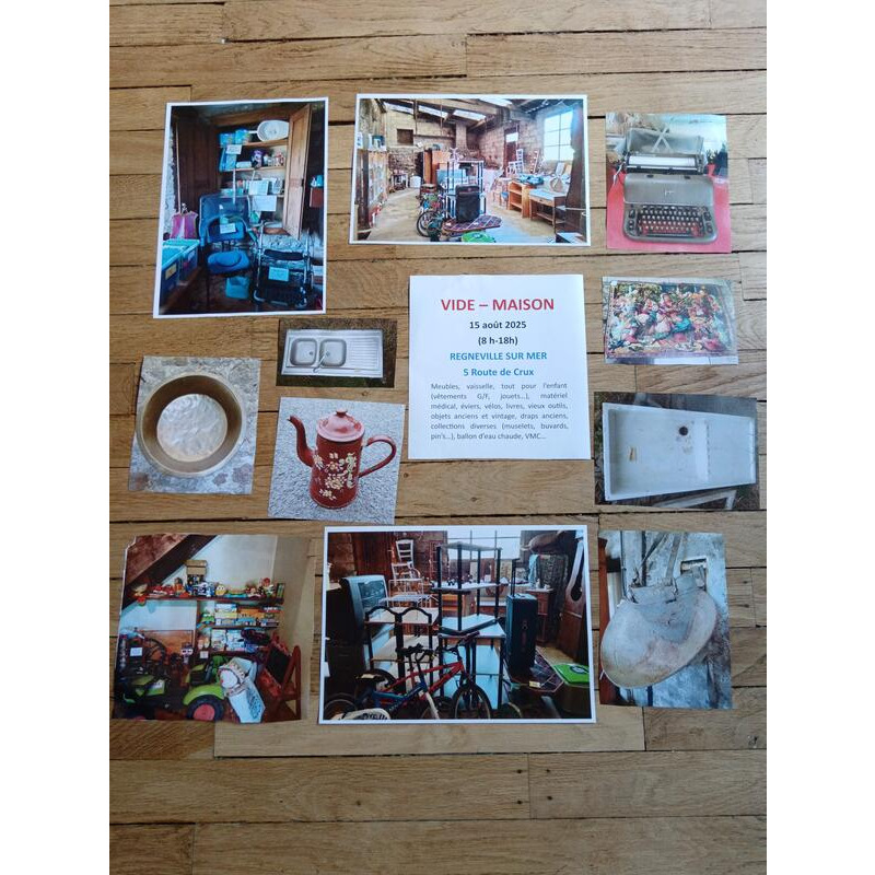 Grand vide-maison (pour partie suite à décès) : meubles (armoires, étagères...), vieux outils, objets anciens et vintage, draps anciens, vaisselle, collections diverses (pin's, buvards, muselets, fèves...) mais aussi tout pour l'enfant (vêtements g/f, jouets...), vélos, vmc, ballon eau chauche, matériel médical (chaise-pot, déambulateur, fauteuil de douche...), éviers, livres, véhicule scénic (168 000 km essence)...