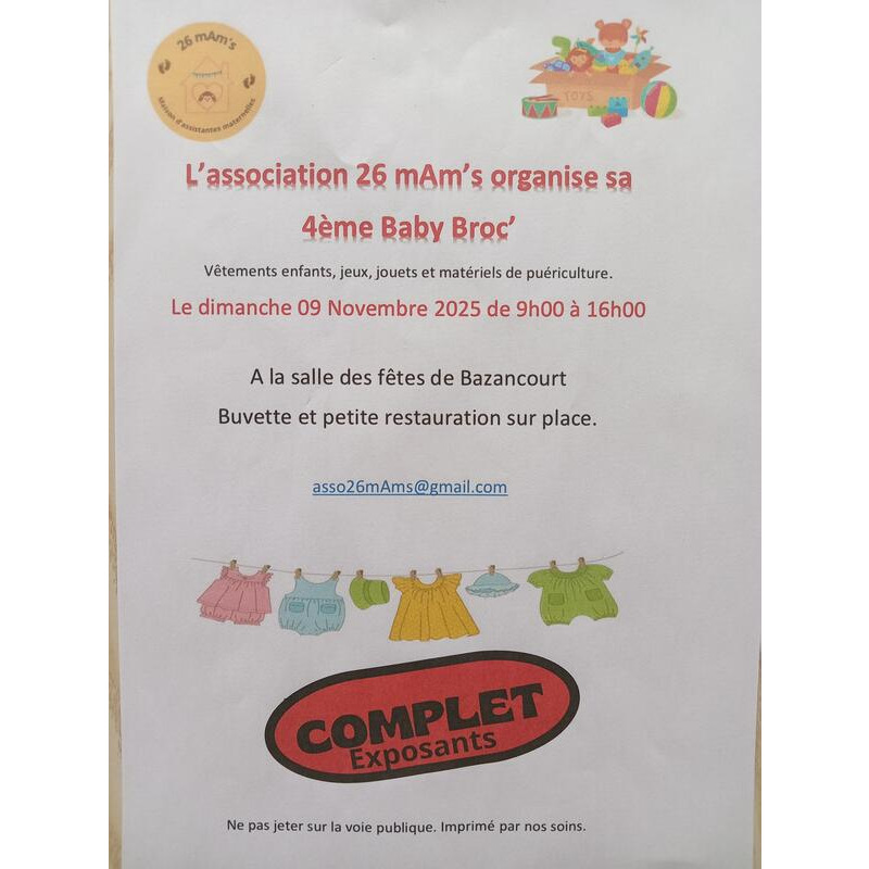 L'association 26 mam's organise sa 4eme baby broc ! Buvette et petite restauration sur place.