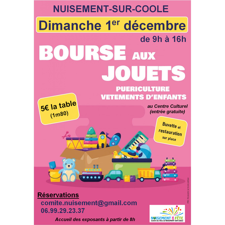 Nuisement en fête - comité des fêtes de nuisement-sur-coole organise une bourse aux jouets / puériculture à l'intérieur du centre culturel de nuisement-sur-coole (51) le dimanche 1er décembre de 9h à 16h.
