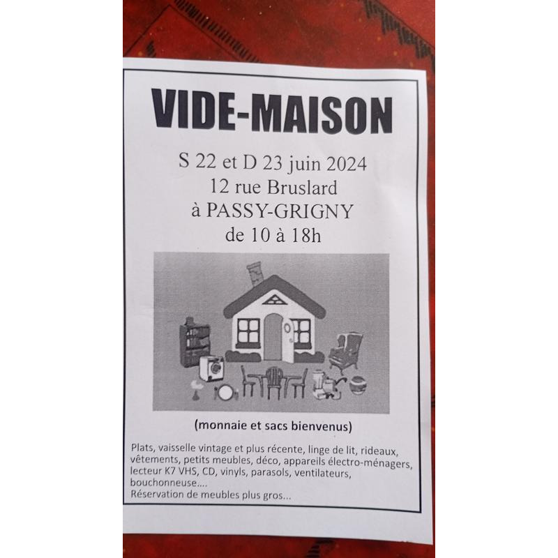 Vide-maison au 12 rue bruslard à passy-grigny, suivre pancartes et ballons.