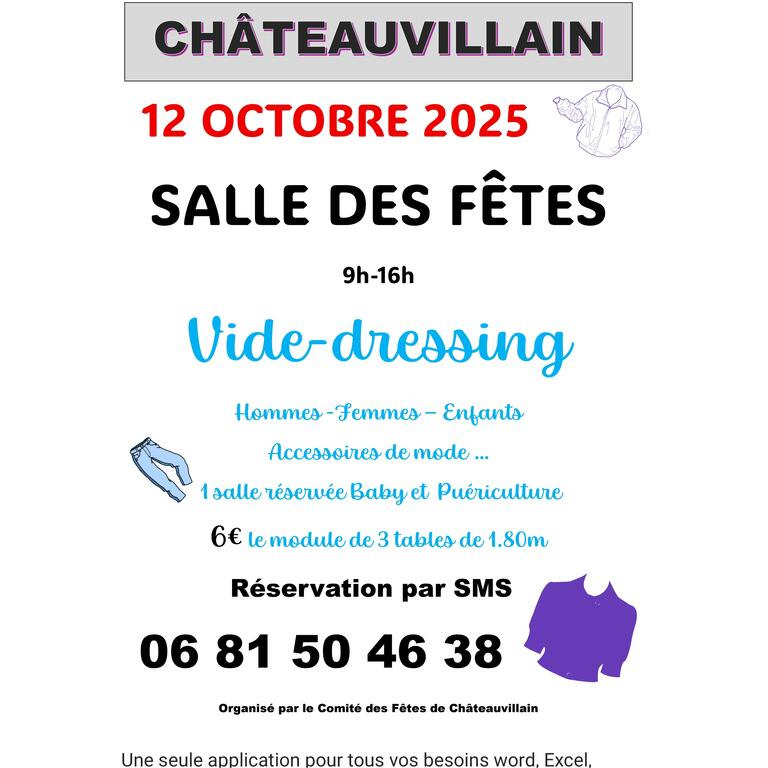Le comité des fêtes de châteauvillain organise un vide-dressing sous réserve de réservations suffisantes à la salle des fêtes.
