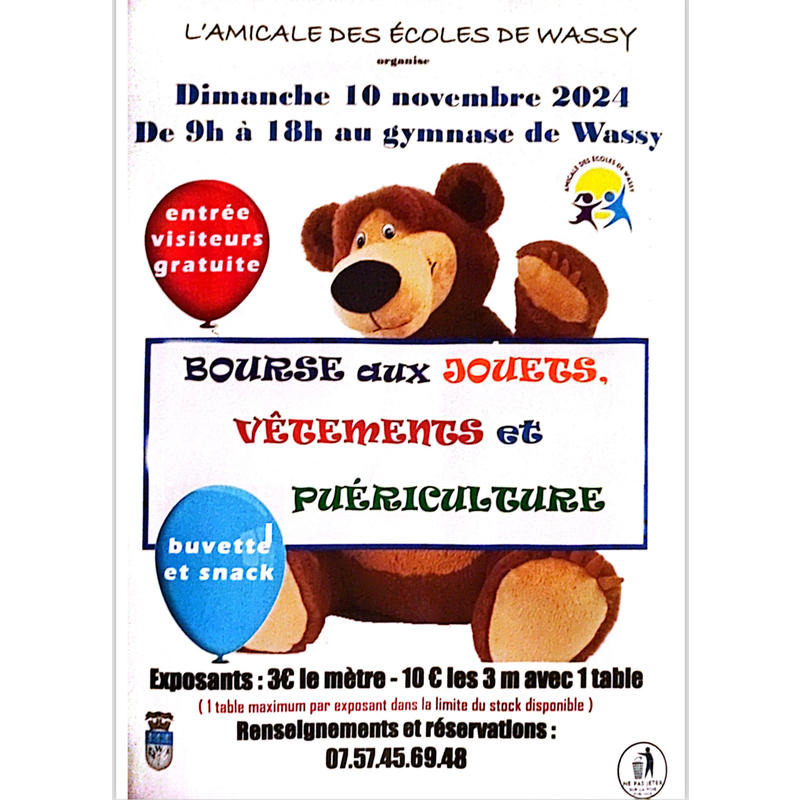 L’amicale des écoles de wassy, organise une nouvelle fois sa grande bourse aux jouets et puériculture.