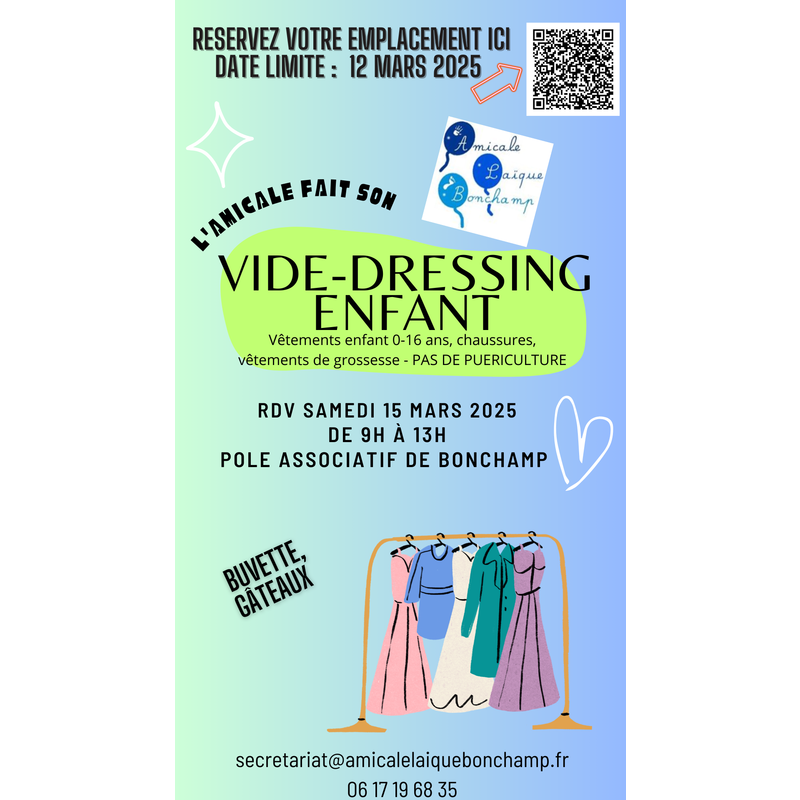 L'amicale laïque des écoles de bonchamp fait son vide-dressing enfant le samedi 15 mars 2025 de 9h à 13h.
