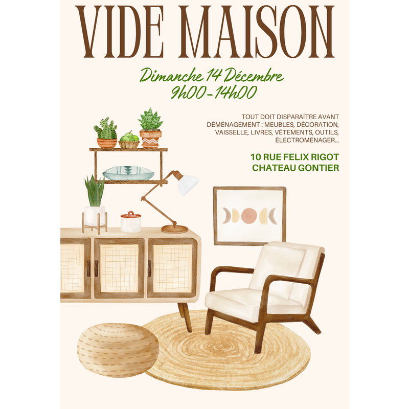 Tout doit disparaitre avant déménagement : meubles, vaisselle, vêtements, décoration, électroménager...