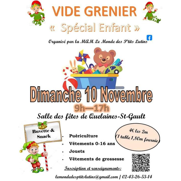 L'association de la mam le monde des p'tits lutins organise son premier vide grenier le dimanche 10 novembre a quelaines saint gault de 9h-17h dans la salle des fetes