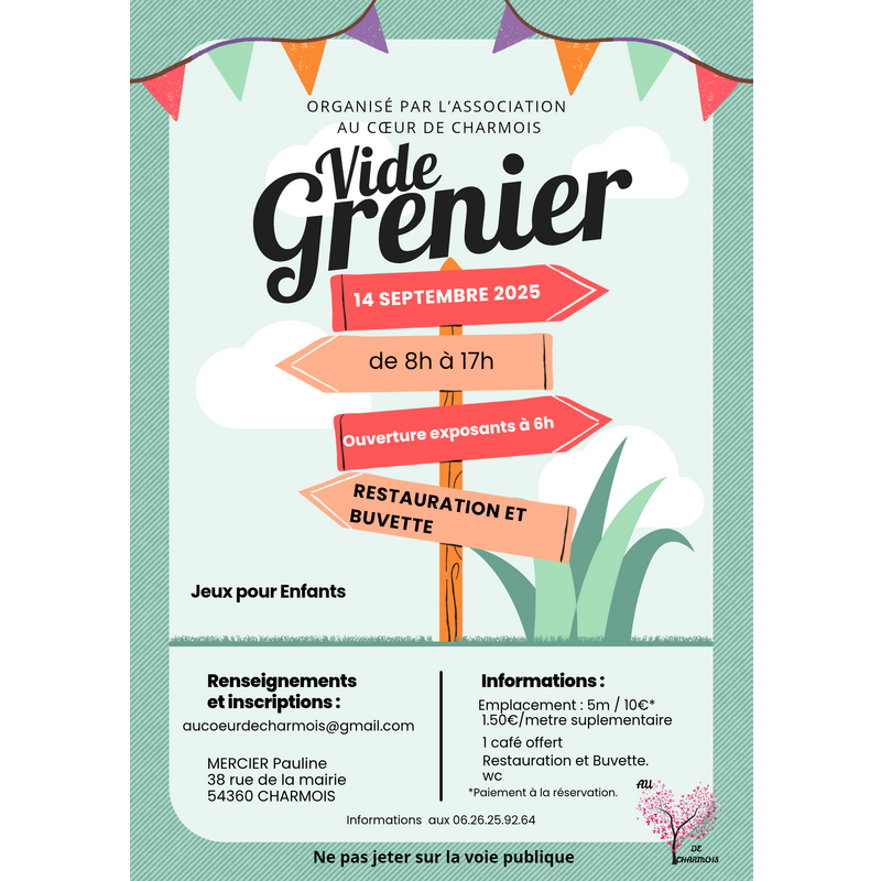 Brocante à charmois – dimanche 14 septembre 2025 lieu : charmois (54) – centre du village horaire : de 8h à 18h date : dimanche 14 septembre 2025 organisée par l’association au cœur de charmois venez chiner, vendre, troquer et flâner lors de notre brocante conviviale à charmois ! Buvette & petite restauration sur place ambiance chaleureuse et familiale entrée gratuite pour les visiteurs.