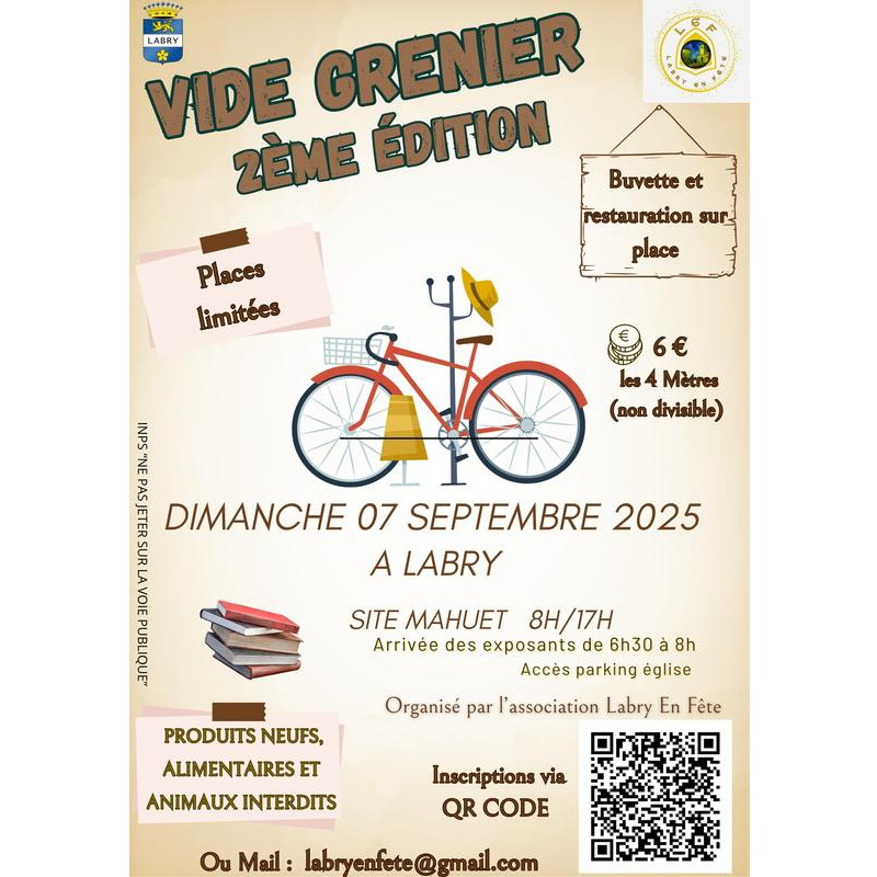 Venez participer au vide-grenier de l'association labry en fête. Restaurant et buvette sur place. Produits neufs, alimentaires et animaux interdits.