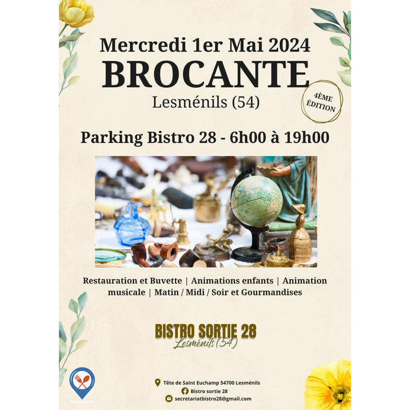 Venez nous rejoindre le mercredi 1 mai à lesménils, sur le parking bistro 28 ! De 6h à 19h, profitez d'une brocante remplie de convivialité et de divertissement.