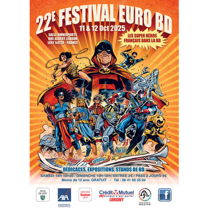 L’association littéraire plum'arts organise le 22e festival euro bd de lexy les 11 et 12 octobre 2025 salle omnisport - rue albert lebrun (à proximité du collège) - 54720 lexy le thème sera "les supers héros français dans la B.D." l'affiche est réalisée par paskal millet invités d'honneur : jean-marc lainé, paskal millet, thierry olivier, jim dandy, auteurs et dessinateurs présents : angleraud fabrice - bad - bailly vincent - bernett sam - bigard claire borderie michel - dandy jim - delvecchio benjamino dépinay christophe - deroubaix ronan - fischer benjamin - galasse florian gilb-lions gilbert - girod thierry - hector régis jakubowski guilain - jakubowski marc - jaminon olivier kaya - kox daniel - laine jean-marc - lega pauline - luguy philippe mezzomo gilles - millet paskal - olivier thierry - perconti davide plisson françois - serra pascal - stibane - tenret manuel vas - wicky jérôme - zeddero-armillei massimo - zytka philippe editeurs et bouquinistes présents : librairie vauban bd neuves - rd flocage produits dérivés - M. Soulier bd occasion P. Malhomme bd occasion - furio bd de collection - M. Jouve n bd occasion bulles et cie bd occasion/collection - gallerie des bulles bd occasion/collection thierry soumillon bd occasion/collection - rémy vitrines produits dérivés bd cubitus bd bd occasion - pierre-bernard vilm bd occasion editions reborn editeur de mangas - limbourg bd collection M. Messmer bd collection - mediatheque de longwy (uniquement le samedi après-midi) editions le sphinx des glaces bd neuves horaires : samedi de 14h à 18h30 - dimanche de 10h à 18h00 entree : 3 € - pass 2 jours : 4 € (gratuit pour les moins de 12 ans) présent sur : facebook et opale bd organisation : l’association littéraire plum'arts autres renseignements : M.