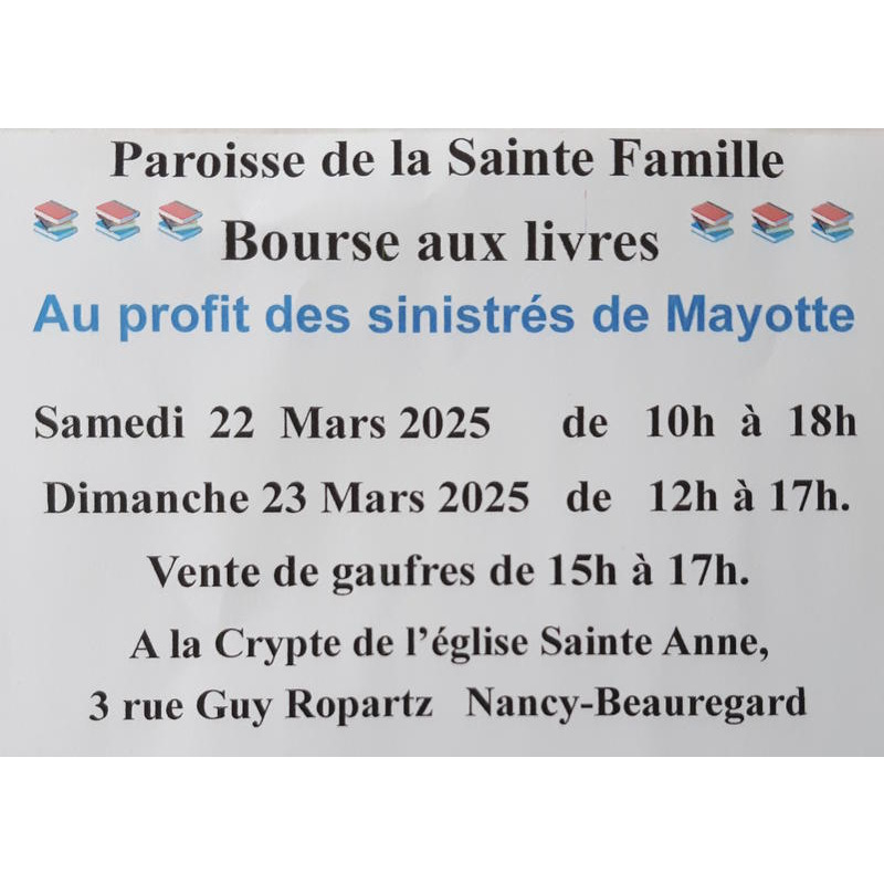 Bourses aux livres, cd, dvd organisée par la paroisse de la sainte famille, dans la crypte de l'église sainte anne, 3 rue guy ropartz, nancy.