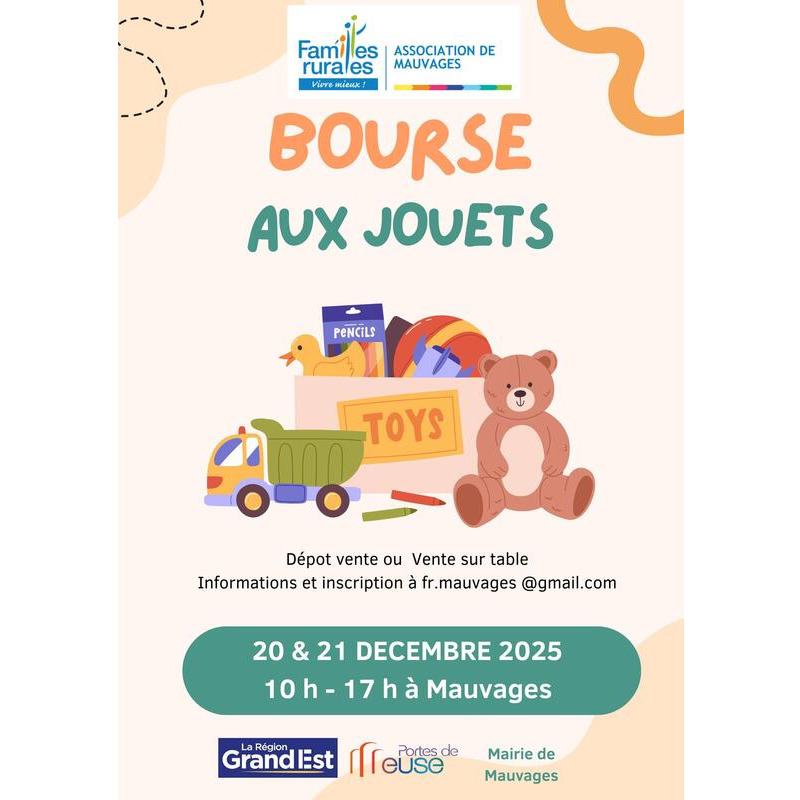 Familles rurales de mauvages organise une bourse aux jouets le 20 et 21 décembre 2025 de 10h à 17h.