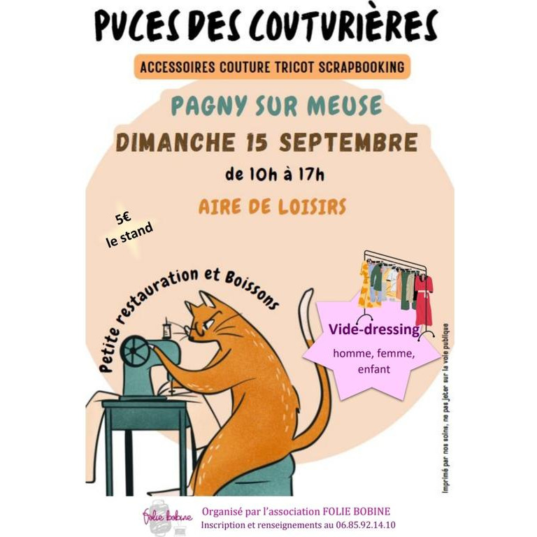 L'association "folie bobine" organise sa 1ère puce des couturières (vente couture, scrapbooking, crochet) le dimanche 15 septembre de 10h à 17h à l'aire de jeux (city stade) de pagny sur meuse.